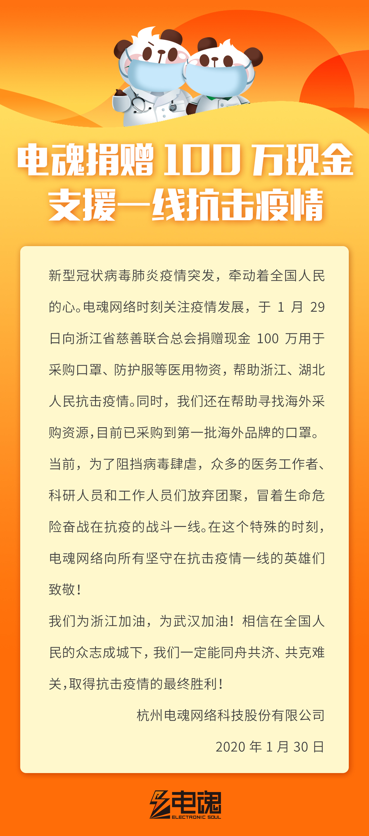 电魂捐赠一百万元现金支援一线抗击疫情!